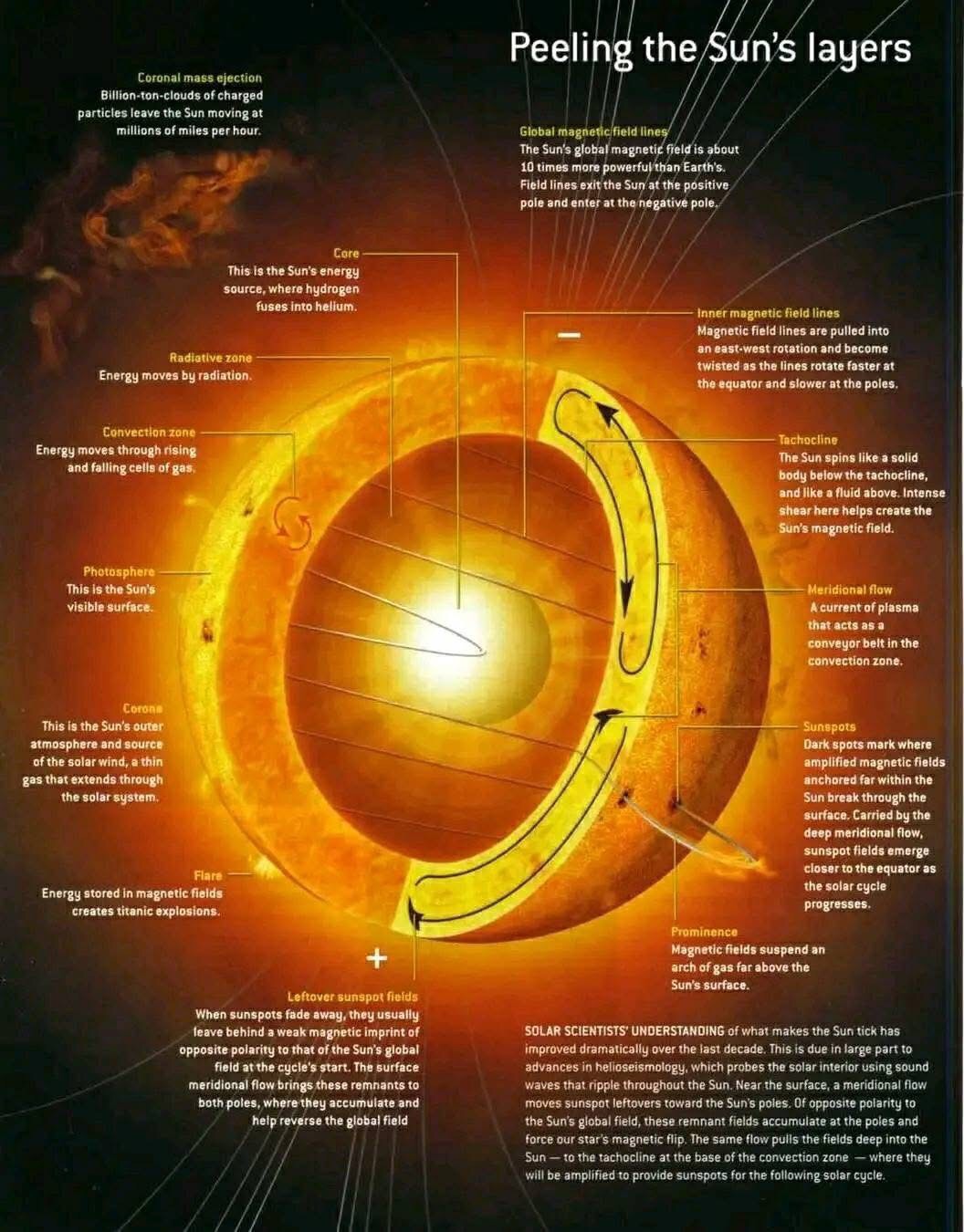 Koliko naših prijatelja zna da postoji “sunce unutar Sunca”? Ili bizarna, nova pronađena zona ispod solarne površine, tzv. tahoklin (ispod nje Sunce rotira kao čvrsto, a iznad kao tečno tijelo – što stvara veliko trenje), isključivo odgovorna za njegovo “nasilno ponašanje”? Ili da smo nedavno doživjeli neuobičajen solarni ciklus u više od dvjesto godina koliko ga posmatramo – što je vjerovatno utjecalo i na globalno zatopljenje? Ili da Sunce ima puls čiji se ritam mijenja svakih 11 godina. Ili zastrašujuće stvari, kao što je vladin konzorcij koji upozorava da određena vrsta solarne oluje može u svakom trenutku učinkovito uništiti našu mrežu napajanja, s popravkom vrijednom od jedne do dvije milijarde dolara?