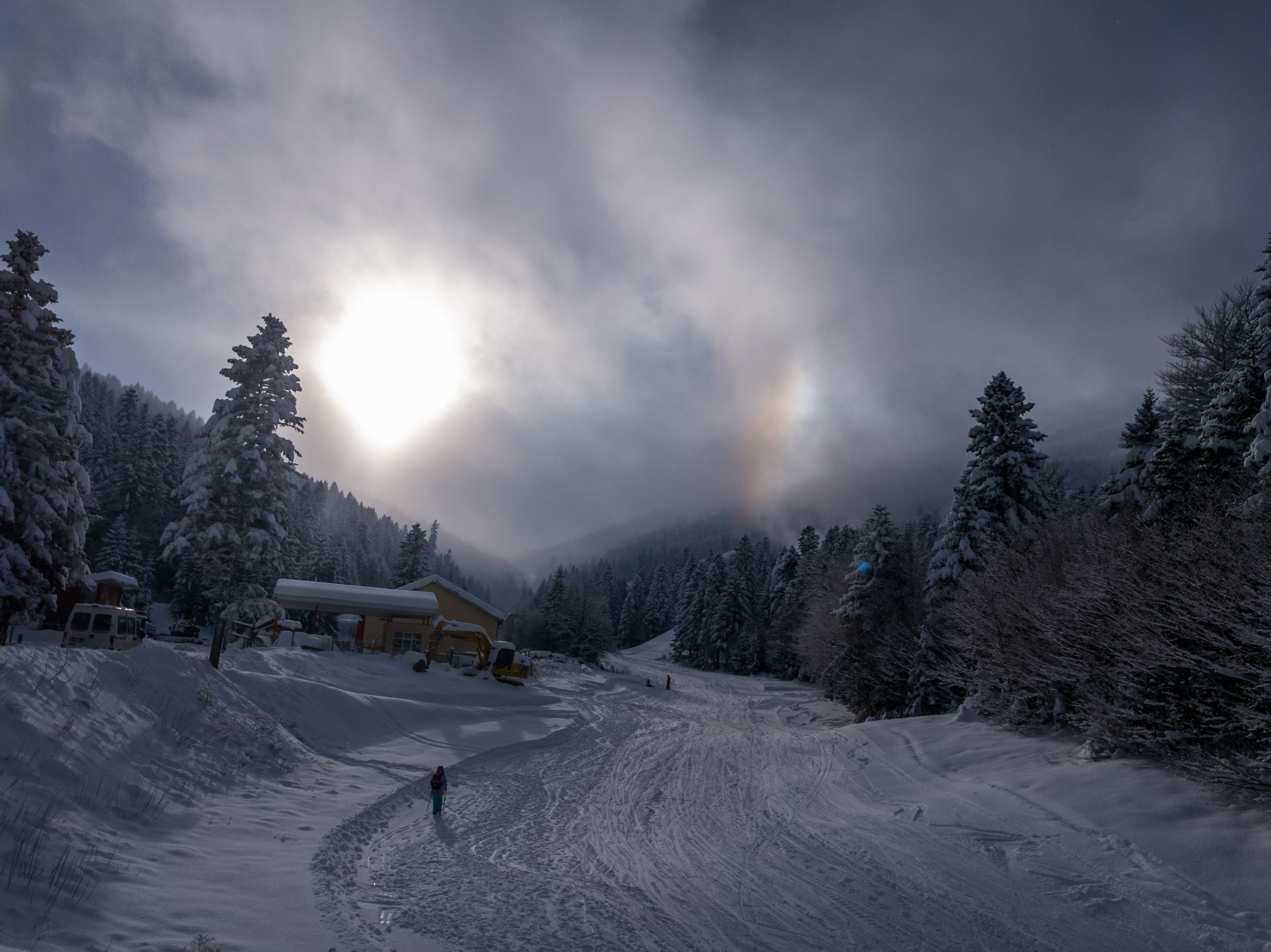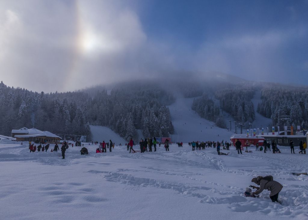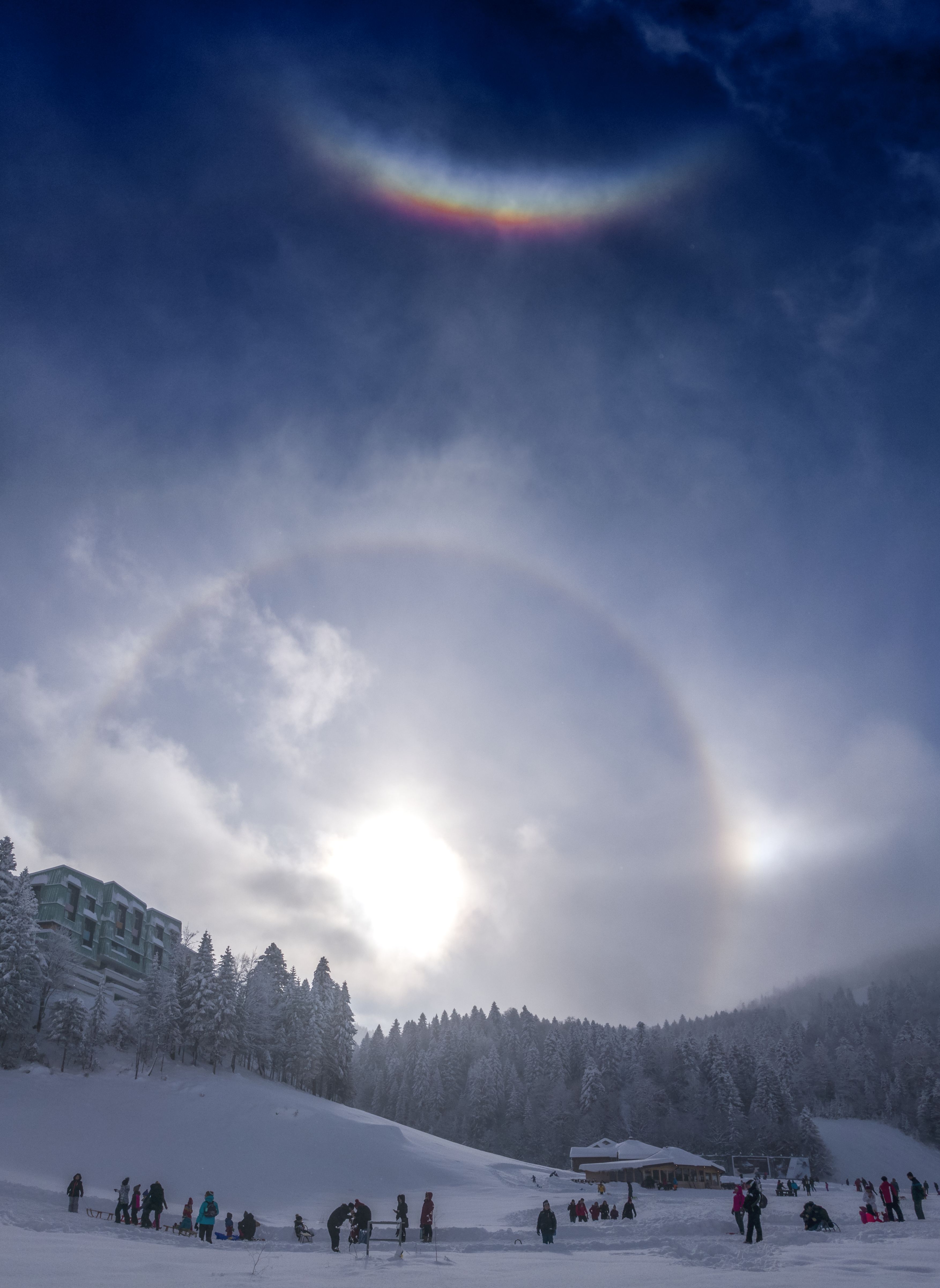 Desni parhelij, 22° halo, parhelijski krug i cirkumzenitalni luk. Bjelašnica, dec. 2016.