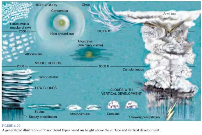 Na slici dole date su, generalno, vrste oblaka na osnovu njihove visine (preuzeto iz knjige “Essentials of meteorology”, C. Donald Ahrens).