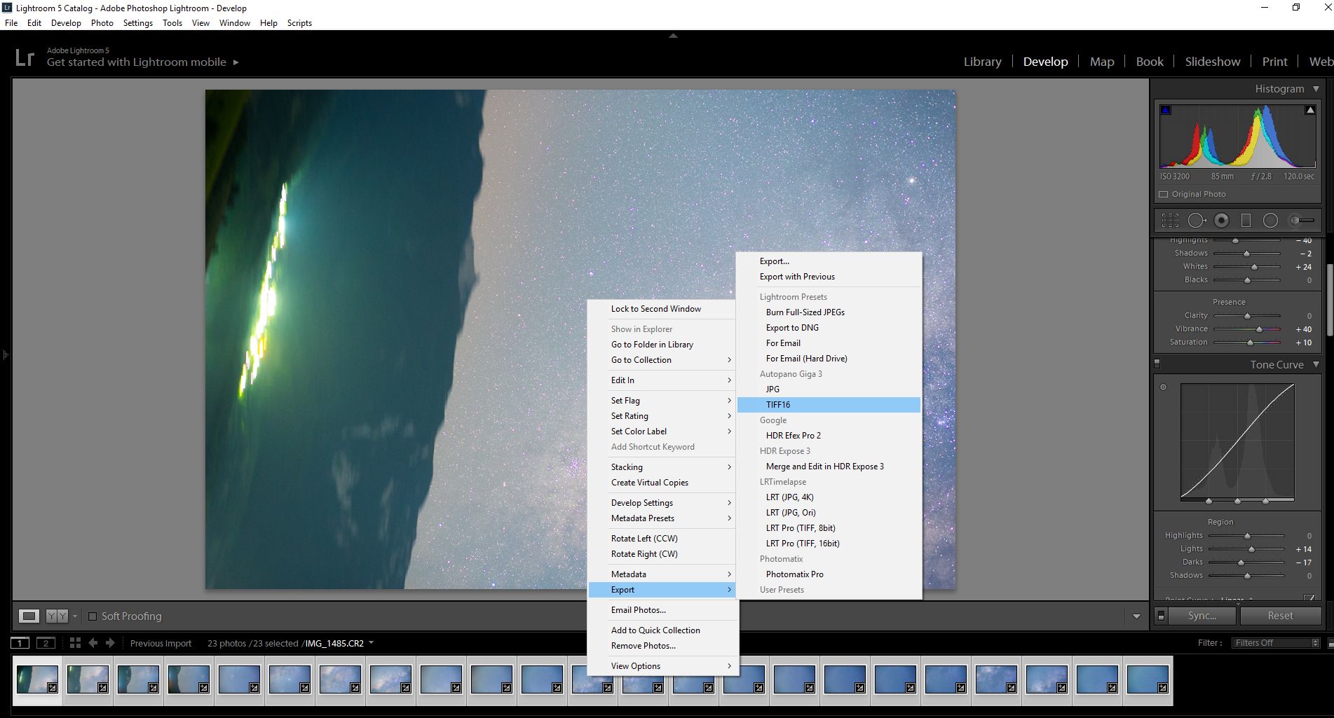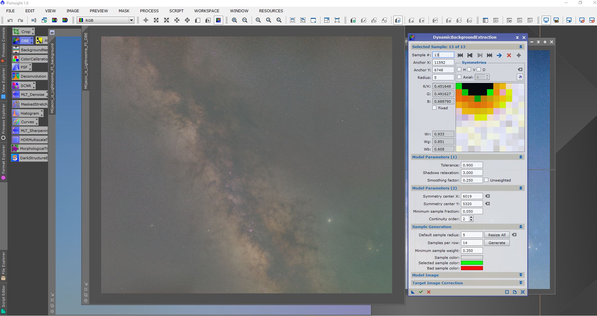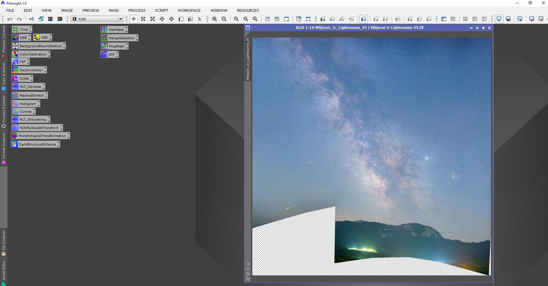 Na donjoj (kropovanoj) slici Mliječni put je malo zarotiran, a takođe se vidi i njegov gornji dio. Ovdje je pokušano da se ukloni hromatska aberacija oko zvijezda zbog upotrebe objektiva Canon 85mm. Postupak obrade je bio sličan (ne isti).