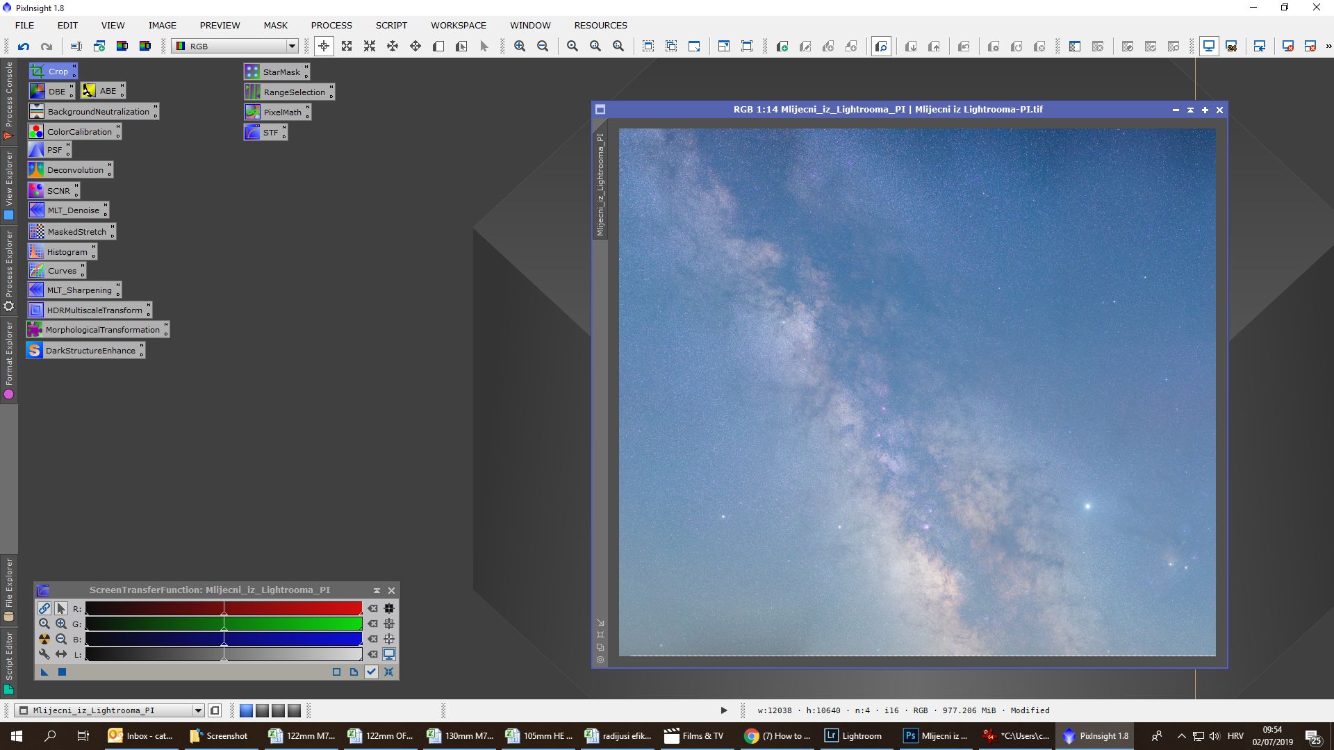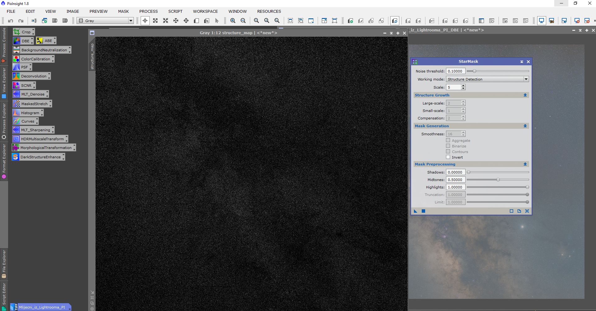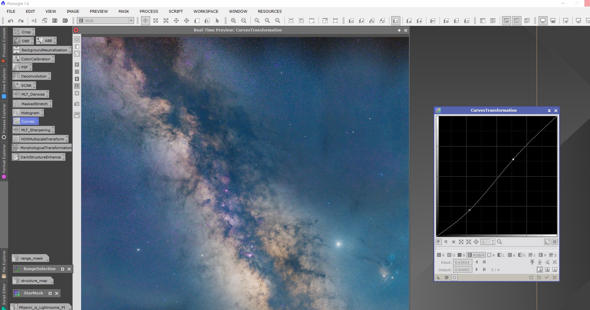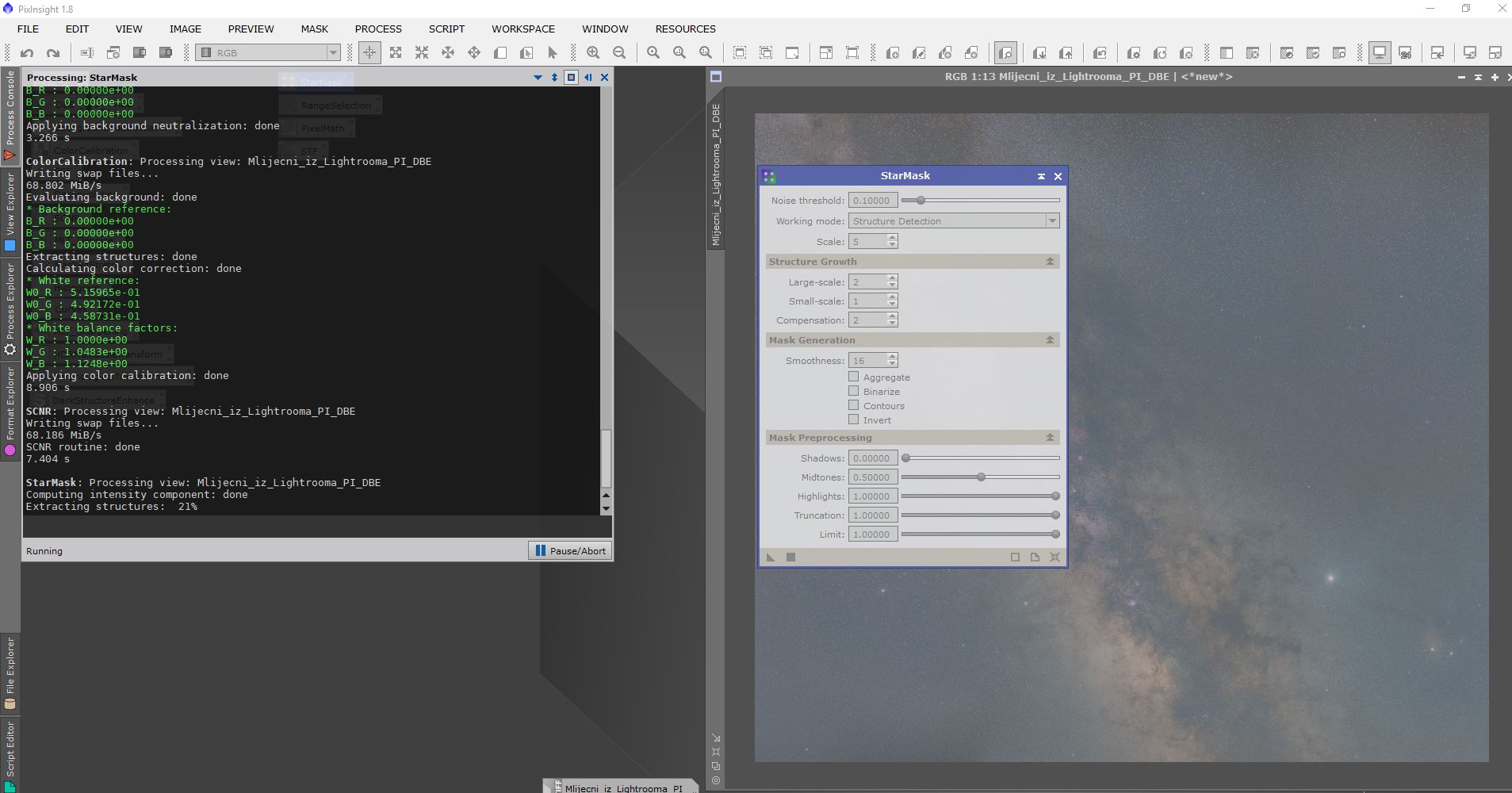 Obrada se sastojala od procesiranja u programima Pixinsight, Lightroom i Photoshop. Svaki program ima svojih specifičnosti i potrebno je određeno vrijeme da se savladaju. Osim toga, svi su relativno skupi. Obrada je trajala duže od samog snimanja. Oni koji su pokušali obrađivati Mliječni put znaju sa kakvim poteškoćama se sreću. Jedna od tajni dobrog snimka naše galaksije (manje šuma, više detalja) je snimanje sa većim fokusnim dužinama i potom spajanje u mozaik. Na slikama dole je prikazan ukratko postupak obrade.