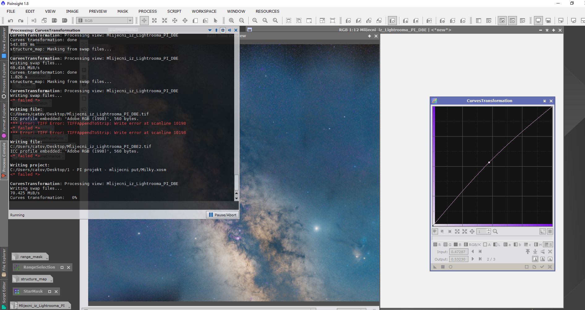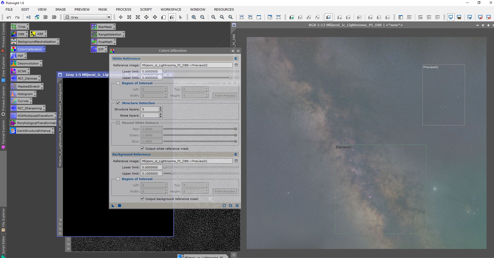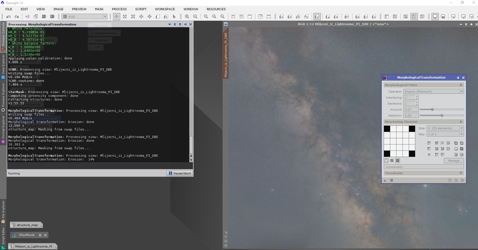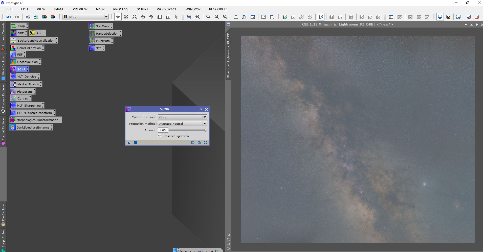 Obrada se sastojala od procesiranja u programima Pixinsight, Lightroom i Photoshop. Svaki program ima svojih specifičnosti i potrebno je određeno vrijeme da se savladaju. Osim toga, svi su relativno skupi. Obrada je trajala duže od samog snimanja. Oni koji su pokušali obrađivati Mliječni put znaju sa kakvim poteškoćama se sreću. Jedna od tajni dobrog snimka naše galaksije (manje šuma, više detalja) je snimanje sa većim fokusnim dužinama i potom spajanje u mozaik. Na slikama dole je prikazan ukratko postupak obrade.