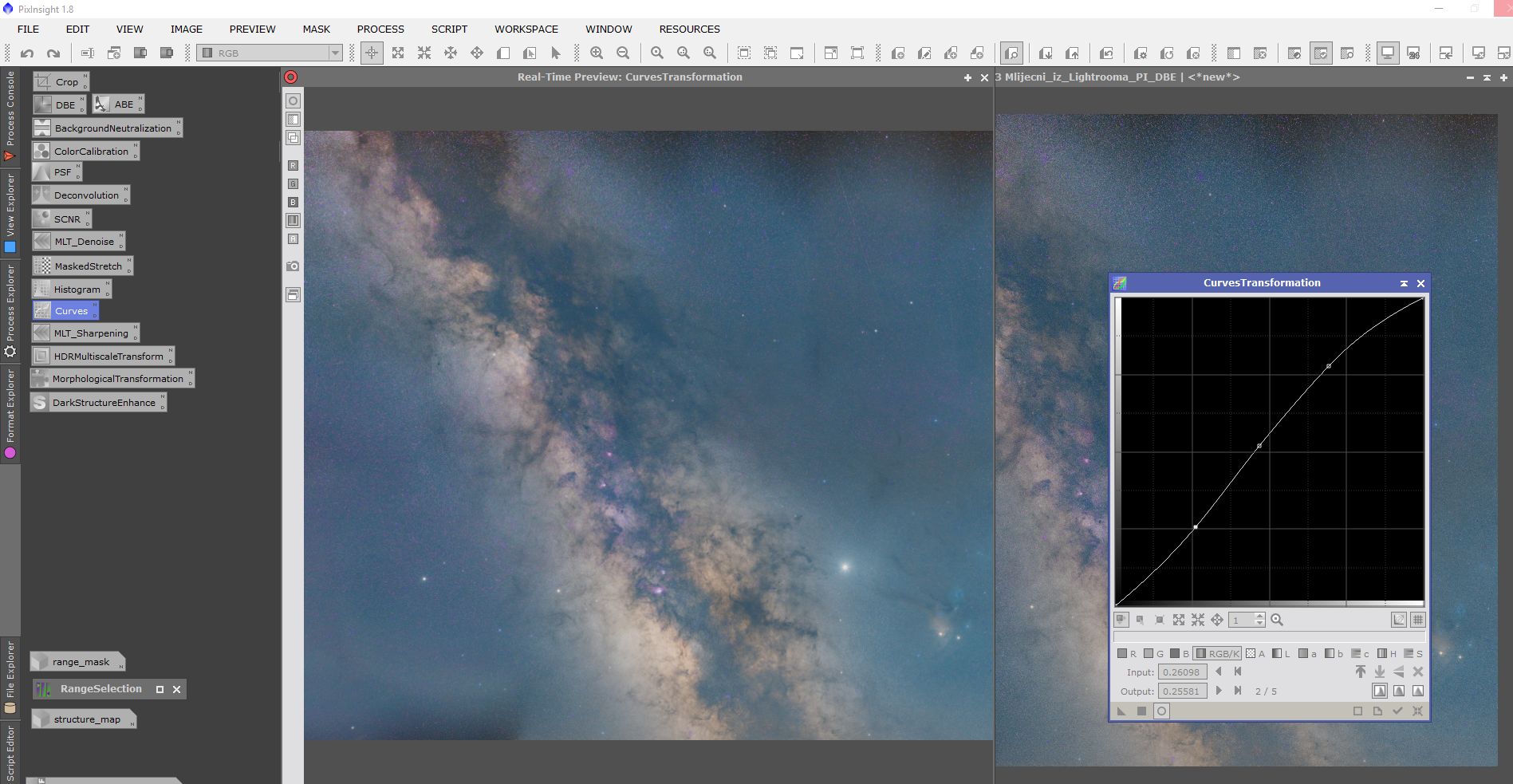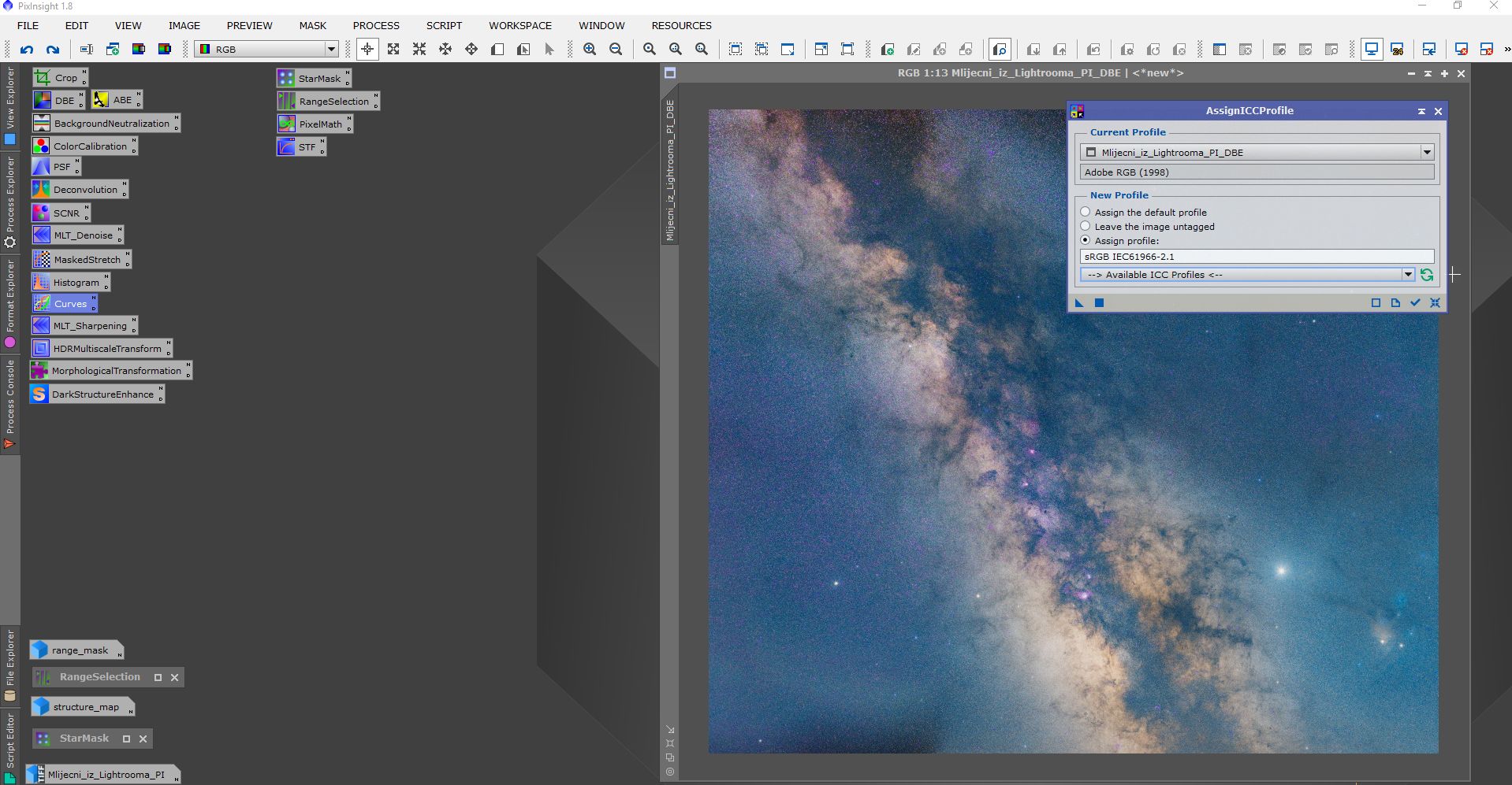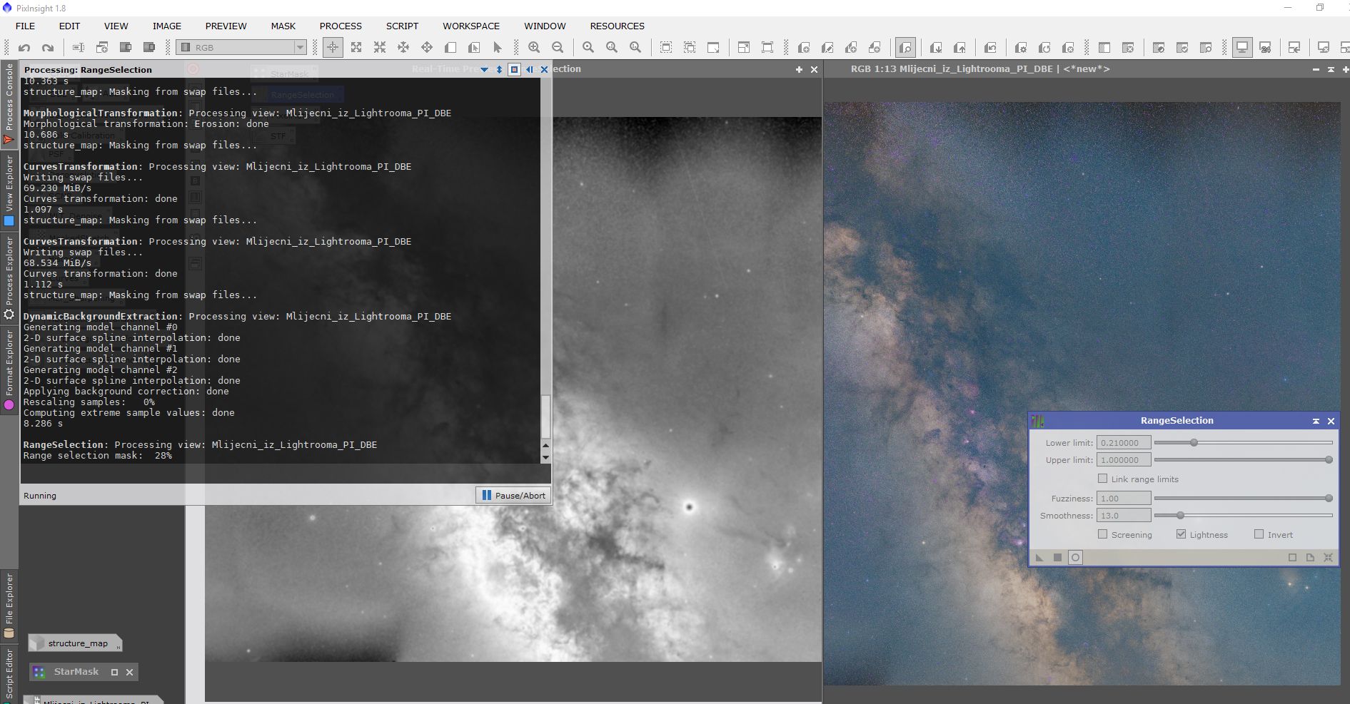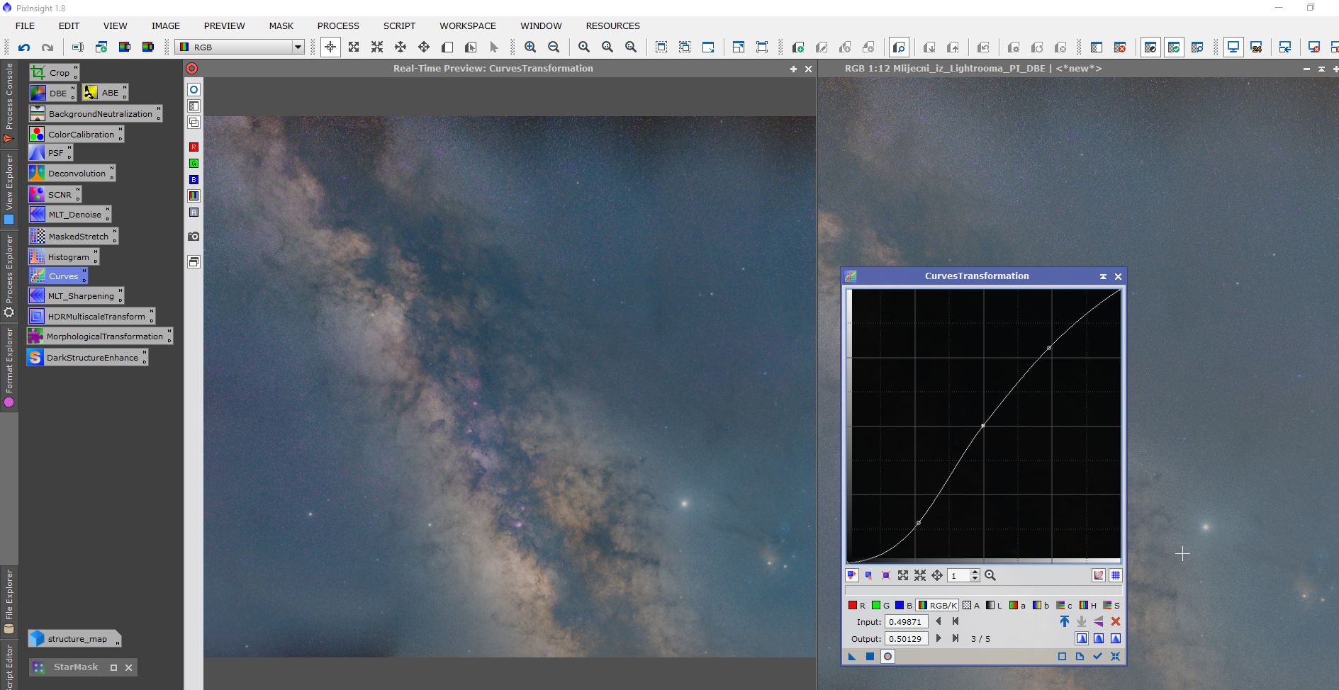 Obrada se sastojala od procesiranja u programima Pixinsight, Lightroom i Photoshop. Svaki program ima svojih specifičnosti i potrebno je određeno vrijeme da se savladaju. Osim toga, svi su relativno skupi. Obrada je trajala duže od samog snimanja. Oni koji su pokušali obrađivati Mliječni put znaju sa kakvim poteškoćama se sreću. Jedna od tajni dobrog snimka naše galaksije (manje šuma, više detalja) je snimanje sa većim fokusnim dužinama i potom spajanje u mozaik. Na slikama dole je prikazan ukratko postupak obrade.
