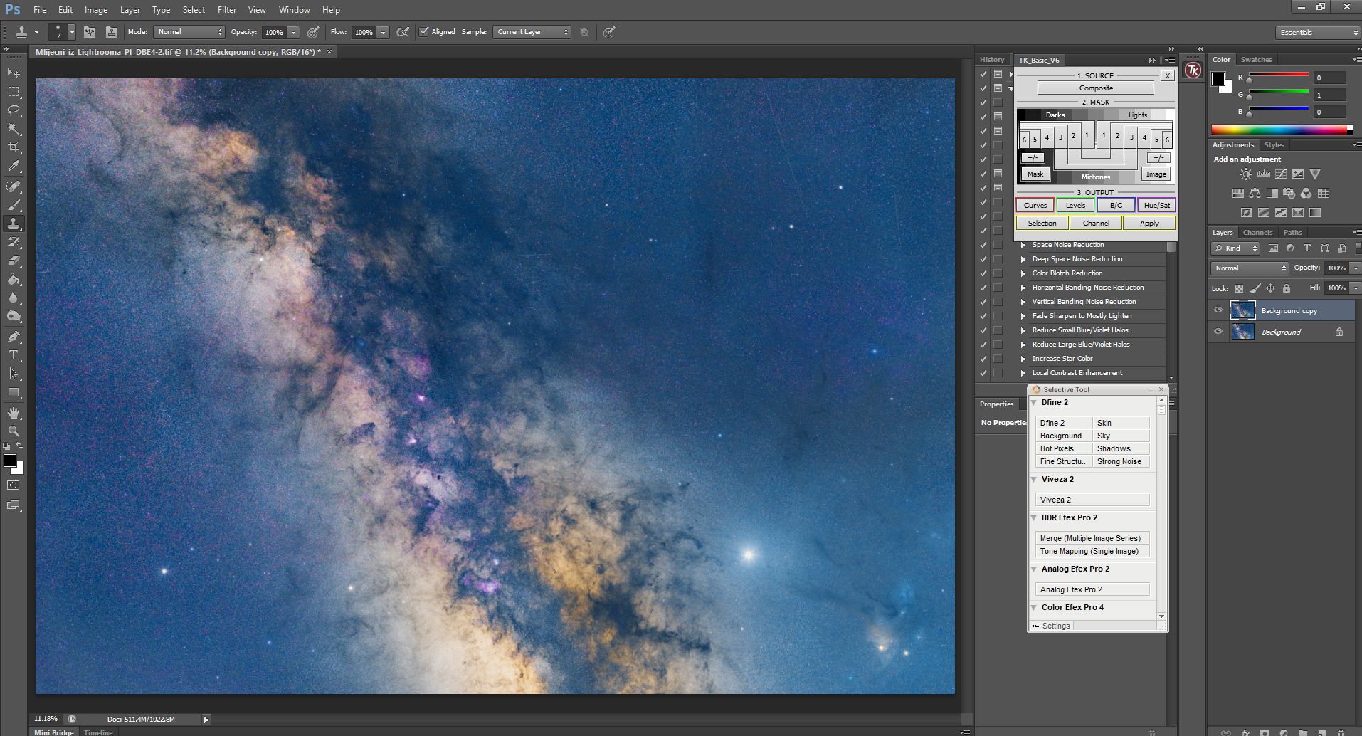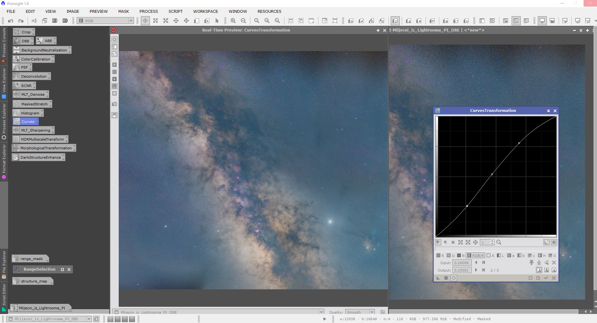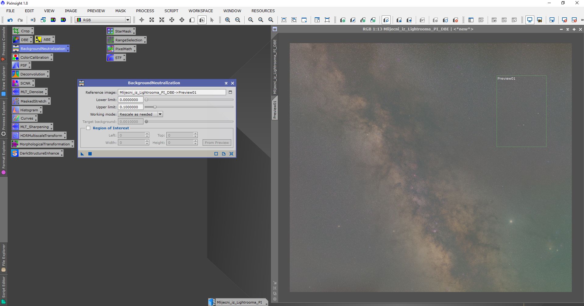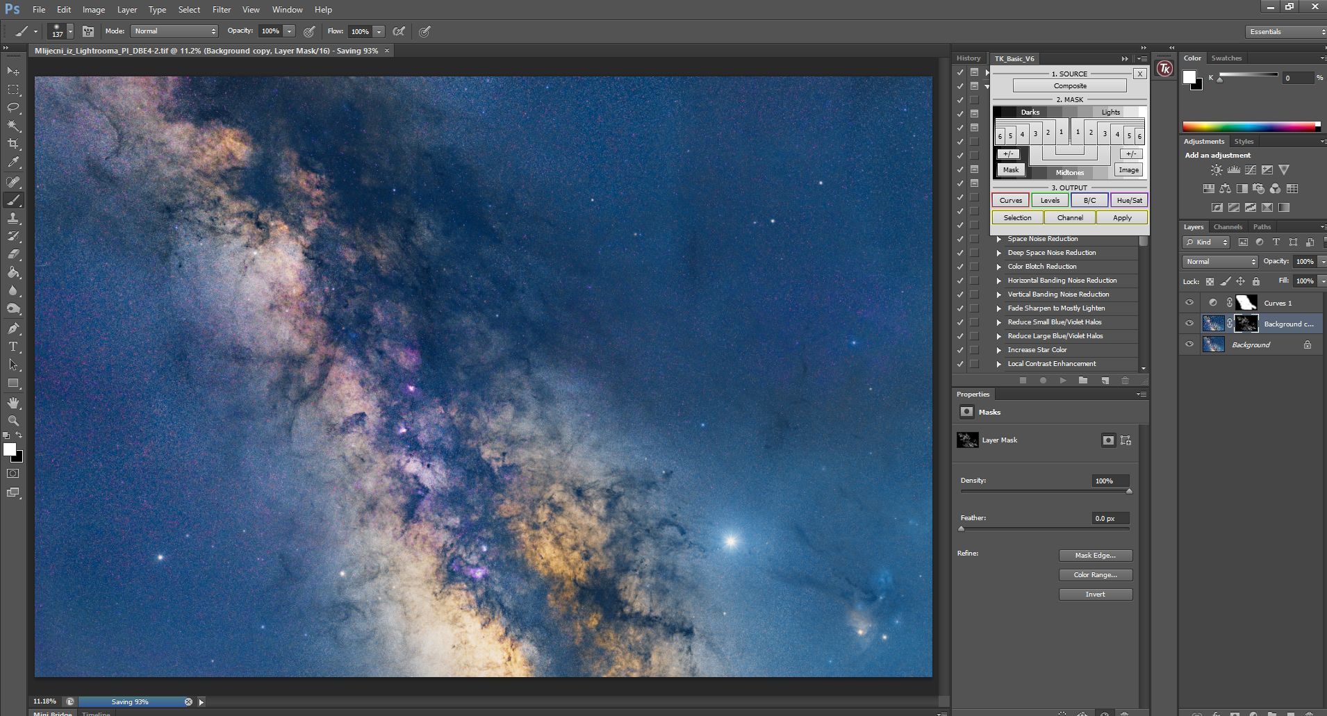 Obrada se sastojala od procesiranja u programima Pixinsight, Lightroom i Photoshop. Svaki program ima svojih specifičnosti i potrebno je određeno vrijeme da se savladaju. Osim toga, svi su relativno skupi. Obrada je trajala duže od samog snimanja. Oni koji su pokušali obrađivati Mliječni put znaju sa kakvim poteškoćama se sreću. Jedna od tajni dobrog snimka naše galaksije (manje šuma, više detalja) je snimanje sa većim fokusnim dužinama i potom spajanje u mozaik. Na slikama dole je prikazan ukratko postupak obrade.