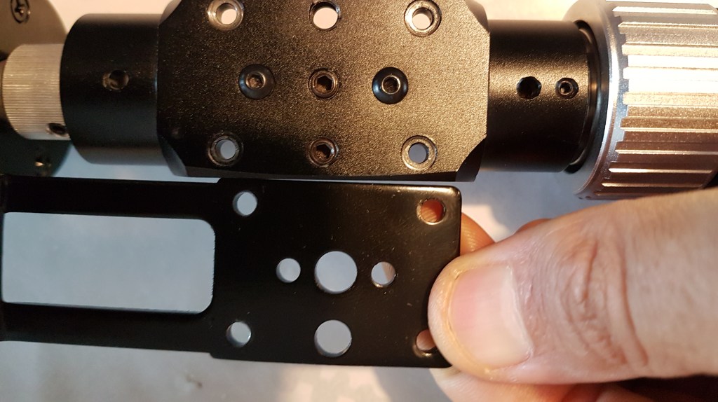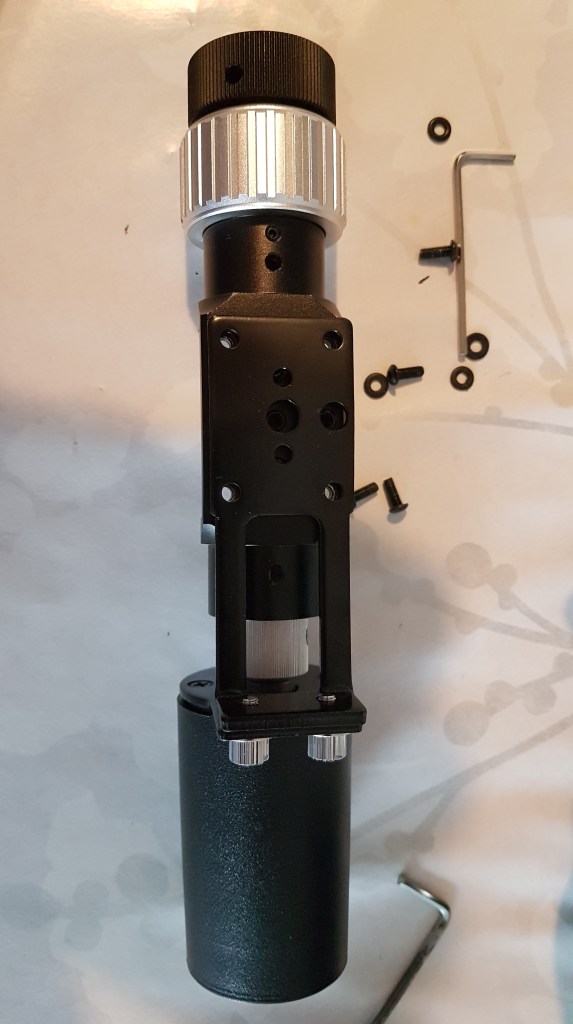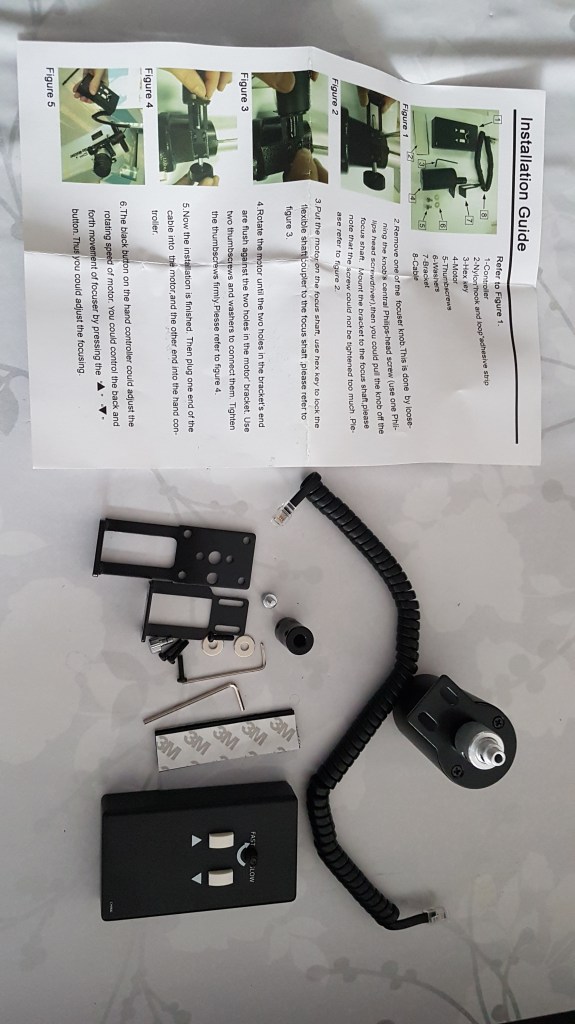 Paket SW fokusera koji dobijate. Cijena sa isporukom u BiH dođe oko 150 KM.Prvo se odvrne glavni (veliki) sivi šaraf sa fokusera i skine crni poklopac sa desne stranePotom se odvrne jedna od ručica za fokusiranje (ona strana gdje se nalazi samo jedna ručica)Potom se odvrnu 4 krajnja crna šarafa sa fokusera, nakon čega je moguće fokuser odvojiti i pri čemu cijev za fokusiranje nastoji izaći van cijevi.Potom se sa druge strane fokusera odvrnu dva šarafa. Jedan služi za odvajanje ručica za fokusiranje od crnog centralnog dijela fokusera, a drugi za labavljenje spoja između centralne osovinice i sive ručice za fokusiranje (ovaj korak se radi kako bi motorni fokuser mogao biti na odgovarajućem odstojanju prilikom fiksiranja na osovinicu).Zatim se motor postavi na drugu stranu osovinice, ali tako da ne dodiruje centralni crni dio fokusera.Zatim se motor za fokuser fiksira za centralni dio fokusera sa dva siva šarafaPotom se naviju 4 specijalna šarafa (dođu u paketu sa motorom) na centralni dio fokusera (po rubovima), pri čemu treba paziti na gumice koje dođu na navoje šarafa (radi boljeg spoja sa metalom ispod).Zatim se na motor spoji kontroler sa kablom, a u kontroler ide jedna 9V baterija. Motor može raditi brže ili sporije, i naravno okretati se u oba smjera. Na najvećoj brzini motora fokuser se i dalje relativno sporo kreće.Na kontroler možete staviti samoljepljivu čičak traku radi lakšeg spajanja npr sa stativom teleskopa (radi lakše manipulacije tokom snimanja).Kao što se vidi, otvor za centralna dva šarafa ne nalazi se na istom mjestu kao kod fokusera na teleskopu. Ova dva šarafa su ključna za fino podešavanja kontakta osovinice i metalne cijevi fokusera (ja sam sa tim imao često problema, pa sam u jednom trenutku šmirglao centralni (ravni) dio cijevi za bolji kontakt sa osovinicom). Zbog toga sam te centralne otvore (2 komada) morao proširiti kako bi imao pristup ka sva 3 centralna šarafa na fokuseru. Nakon toga, mogao sam optimizirati pritisak osovinice na cijev fokusera bez skidanja cijelog poklopca koji spaja motor sa fokuserom.