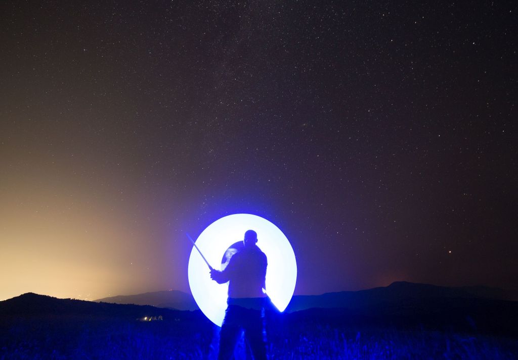 Na slici ispod prikazan je relativno sjajan meteor kako prolazi u pravcu Mliječnog puta. U prednjem dijelu kadra je prenosni setup (Star Adventurer, Canon 1100D i Canon 70-200mm) kojim je sniman region oko zvijezde Sadr i Rho Ophiuchi kompleks.