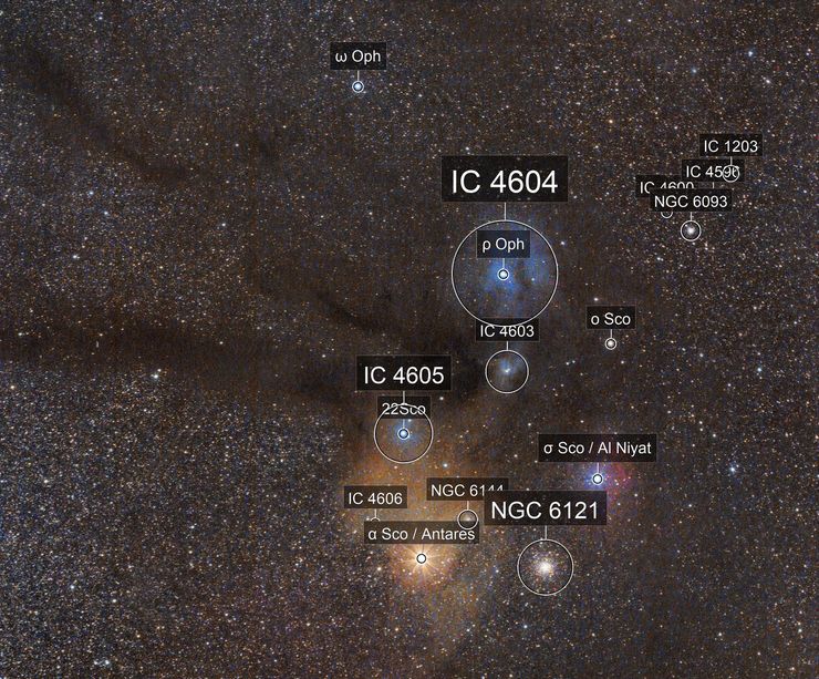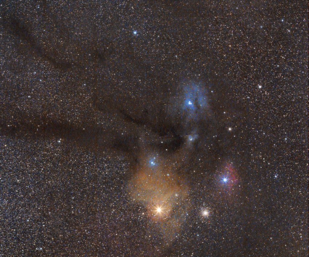 Posebno je zanimljiv tamni region na istočnoj strani ovog kompleksnog oblaka, oko 50 svjetlosnih godina udaljen (u pozadini) od refleksione magline IC 4604. Ovdje se u prostoru prečnika nekoliko svjetlosnih godina nalazi nekoliko zvijezda koje se upravo rađaju.