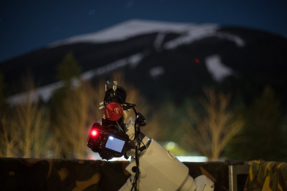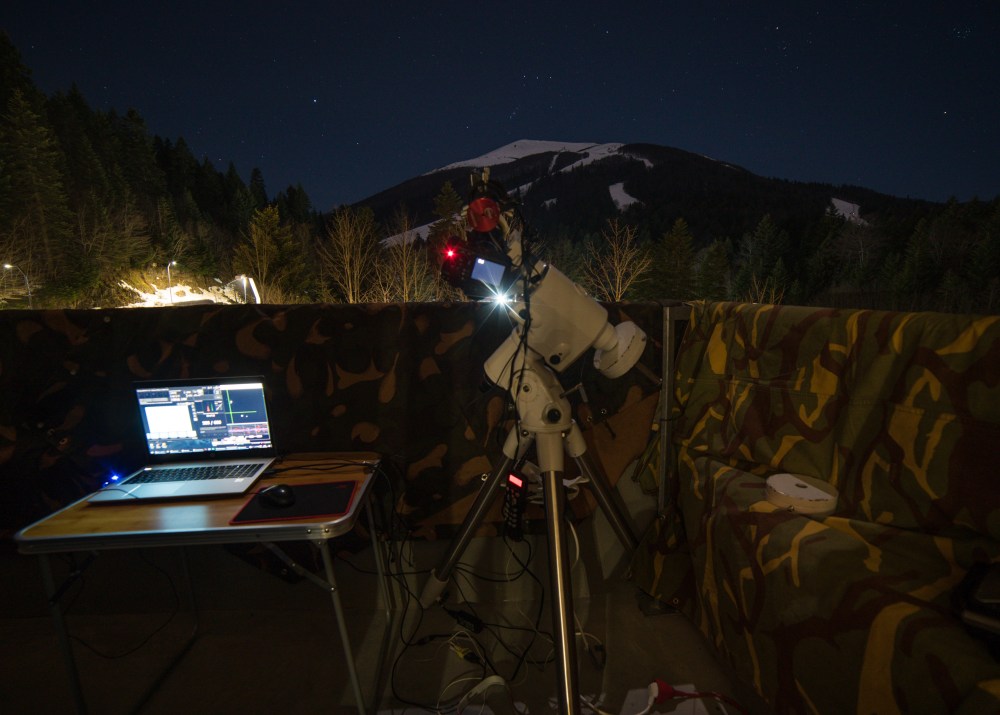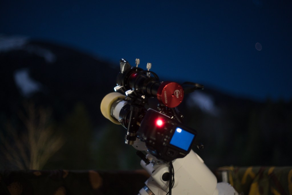Od glavne opreme smo koristili Canon 1100D mod sa TS 50/330 mm teleskopom, na postolju SW EQ6. Za vođenje smo koristili ZWO ASI mono 120 MM-S kameru na finderu SVBony 50 mm. Oprema je bila spojena sa laptopom, na kojem smo radili uz programe Sequence Generator Pro (za brže lociranje mete, uz Plate solver), Backyard EOS (za snimanje sa Canon aparatom) i PHD2 (za vođenje).