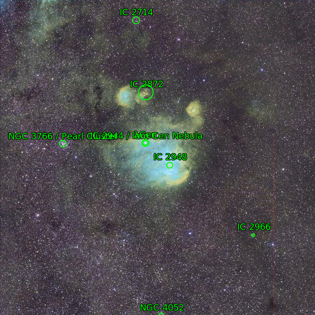 Cijela ova regija je prekrasno područje i za posmatranje teleskopom. U blizini su dvije male magline (RCW 60 (Gum 39) i IC 2872). Tu je i manja okrugla emisiona maglina RCW 61 (Gum 41). Pored magline nalazi se i vrlo bogato otvoreno zvjezdano jato NGC 3766 (Maglina “Biser”, eng. Pearl), a u blizini je i otvoreno jato IC 2714, kao i prekrasno otvoreno jato NGC 3532 i dio magline Eta Carinae. Dole je prikazana maglina sa nazivima pojedinih dijelova (astrometrija urađena na astrometry.com).
