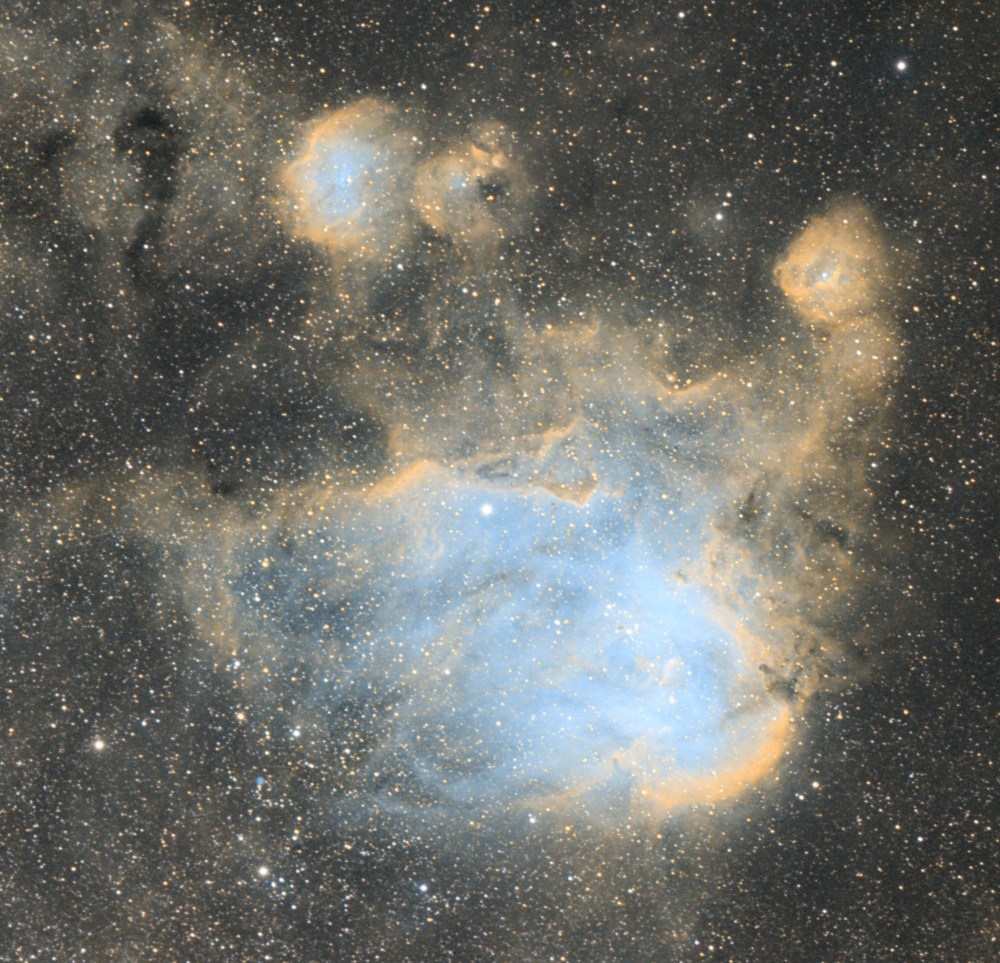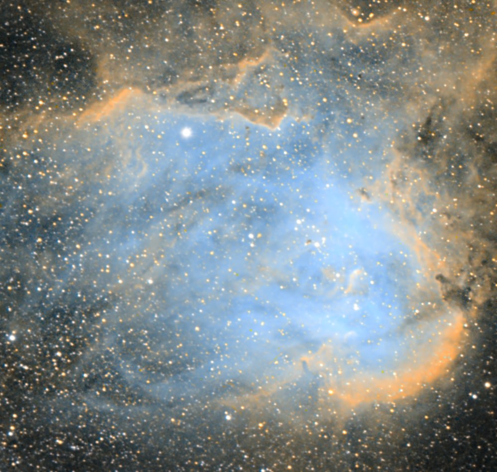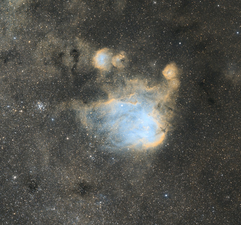 Iz australijske opservatorije Heaven’s Mirror (Yass, North South Wales; 530 m n.v.) su mi poslali set podataka o maglini IC 2944, snimljenoj uskopojasnim filterima. Snimci su bili: 3 x 10 min sa H-alfa, 4 x 10 min sa O-III i 2 x 10 min sa S-II filterom, za ukupno 90 min ekspozicije. Teleskop je bio Takahashi FSQ 106-ED (fokus 530 mm, prečnik 106 mm), spojen na kameru FLI PL16803. Obradu sam izvršio u softverima Deep Sky Stacker, Pixinsight i Photoshop. Korišteno je mapiranje SHO tehnikom, pri čemu je kasnije upotrebljen SCNR alat u Pixinsight (tako da je, u konačnici, hidrogen u maglini prikazan zlatnom bojom, a oksigen plavom). Više o uskopojasnim filterima, tehnikama obrade i paletama za mapiranje kanala možete pročitati na ovom linku.