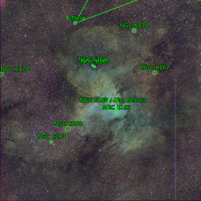 Što se tiče prvobitnog cilja snimanja – emisione magline “Vijenac” (NGC 6168), udaljene od nas oko 4000 svj. godine, ona se nalazi u centralnom dijelu magline “Baby elephant”, u pravcu sazviježđa Oltar (Ara). Neki astrofotografi koriste i naziv “Ruke” jer ih tamne strukture unutar magline “Viejnac” podsjećaju na ljudske šake. Otvoreni zvjezdani skup NGC 6193, vidljiv golim okom, najviše je odgovoran za sjaj magline NGC 6188. Generalno, maglina NGC 6188 je region stvaranja zvijezda i isklesana je od masivnih mladih zvijezda koje su se ne tako davno tamo formirale – neke su stare “tek” nekoliko miliona godina. Moguće da je ovo aktivno porodilište zvijezda pokrenuo posljednji val formiranja supernovih u ovom području.