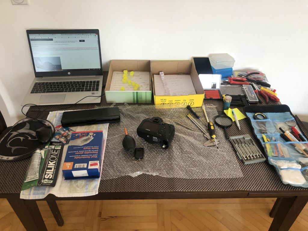 Od alata vam i ne treba nešto previše (Torx 6, mali krstasti odvijač, skalpel, nitrilske rukavice, digitalno mjerilo sa rezolucijom od 1/100 ili 1/1000 mm). Ja sam pripremio i više alata nego što treba, za svaki slučaj. Takođe, pripremio sam kutiju u koju sam redom ubacivao vijke nakon svakog koraka (bilo je 37 koraka).
