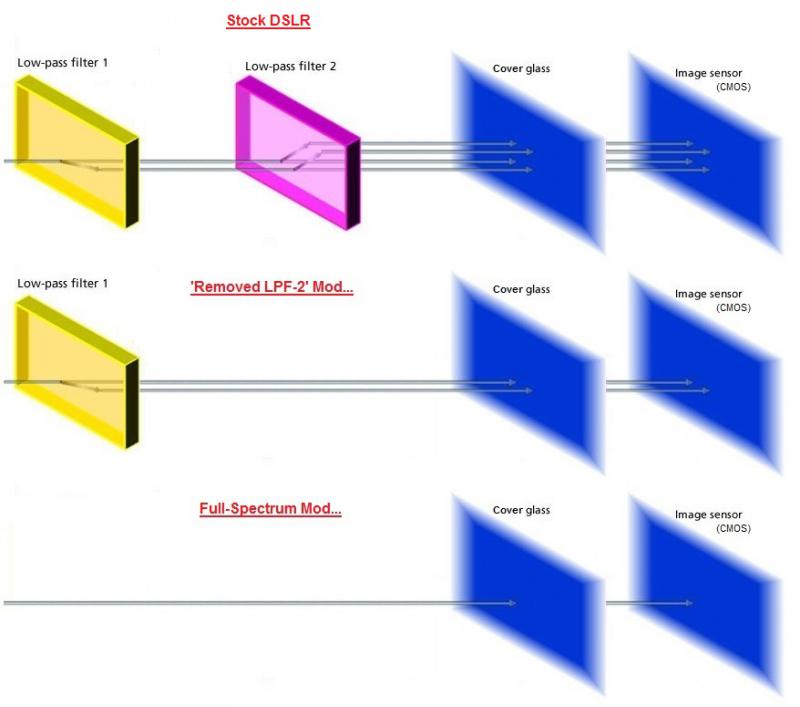 Cilj postupka je da aparat može “hvatati” i IC dio spektra (naravno, i UV) u kojem dominantno zrače emisione magline (kao što je npr. maglina Orion). Uz podešavanje “Custom White Balance” sa ovakvim aparatom se može snimati i po danu, a i autofokus radi ako se dobro uradi modifikacija.