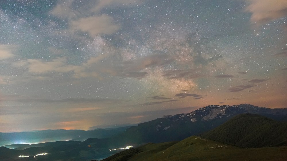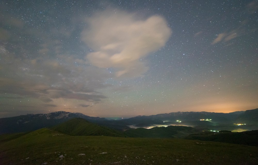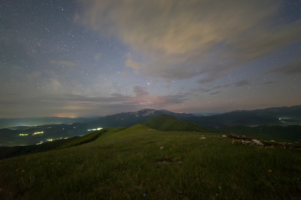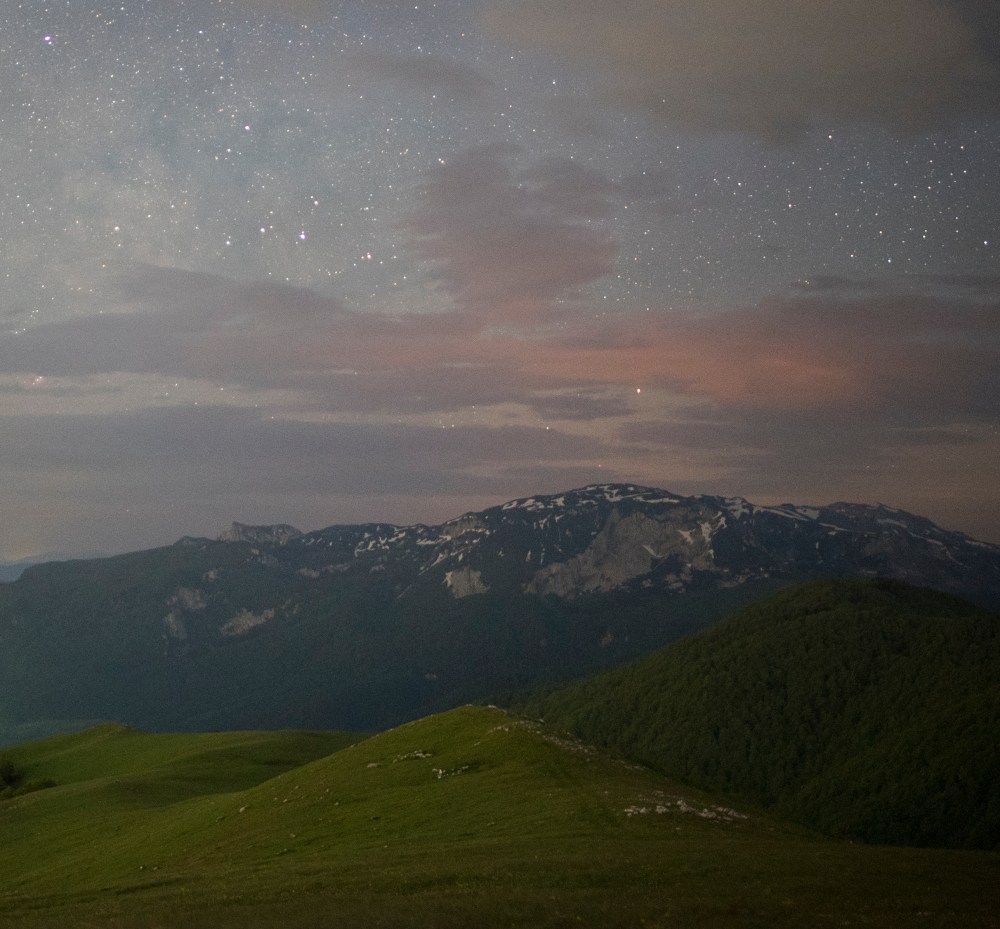 Pogled na planine Treskavicu (lijevo) i Visočicu (desno). Oblaci sakrivaju Mliječni put. U kotlini vidljiva magla iznad obližnjih sela. Iznad Visočice primjetno je dosta više svjetlosnog zagađenja nego iznad Treskavice.