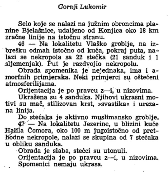 Zanimljivo je da se vrlo teško mogu naći ikakvi podaci o stećcima kod Lukomira. U knjizi Stećci, kataološko-topografski pregled (Š. Bešlagić) sam uspio naći nešto: