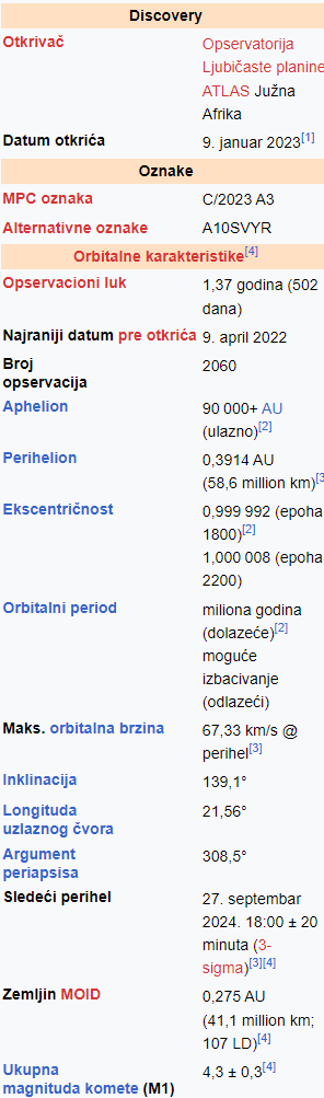 Ovih dana je iznad nas prolazio komet C/2023 A3 (Tsuchinshan – ATLAS). To je kometa iz Ortovog oblaka, otkrivena u Kini 9. januara 2023. i nezavisno pronađena od strane sistema ATLAS Južne Afrike 22. februara 2023. Kometa je prošla perihel na udaljenosti od 0,39 AU (58 milliona km) 27. septembra 2024. godine, kada je postala vidljiva i golim okom. Ovih dana se vidi iz naših krajeva, a s dvogledom je prizor još spektakularniji.