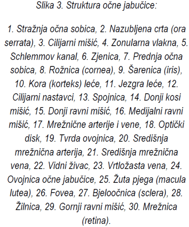 Očna jabučica (lat. bulbus oculi) smještena je u posebnu šupljinu u lubanji (lat. orbita) i okružena sistemom mišića i tkiva koji osim mehaničke zaštite služe i za podmazivanje, vlaženje, čišćenje i pokretanje oka. Orbite su parne koštane šupljine na prednjoj strani lubanje, volumena oko 30 ml. Primarna je zadaća orbita mehanička zaštita oka. Sastoji se od sedam kostiju lubanje koje formiraju četiri orbitalna zida u obliku krnje četverostrane piramide s vrhom okrenutim prema unutrašnjosti glave, a bazom prema naprijed. Kosti tvore krov orbite, medijalnu (ujedno najtanju) i lateralnu stijenku te dno orbite. U vrhu orbitalne piramide se nalaze dvije šupljine kroz koje prolaze vene i živci, kao i optički kanal kroz koji prolazi vidni živac i očna arterija (lat. a. centralis retinae). Očna jabučica struktura je kuglastog oblika, promjera oko 24 mm, smještena u masnom tkivu (funkcionira kao zaštitni jastučić i smanjuje trenje prilikom micanja jabučice) očne šupljine (slika 3), koja se pomoću ekstraokularnih mišića može pomicati u svim smjerovima. Osim očne jabučice i ekstraokularnih mišića, očna šupljina takođe štiti i suznu žlijezdu te brojne vezivne ovojnice, živce i krvne žile, ali ne sadrži limfne žile.