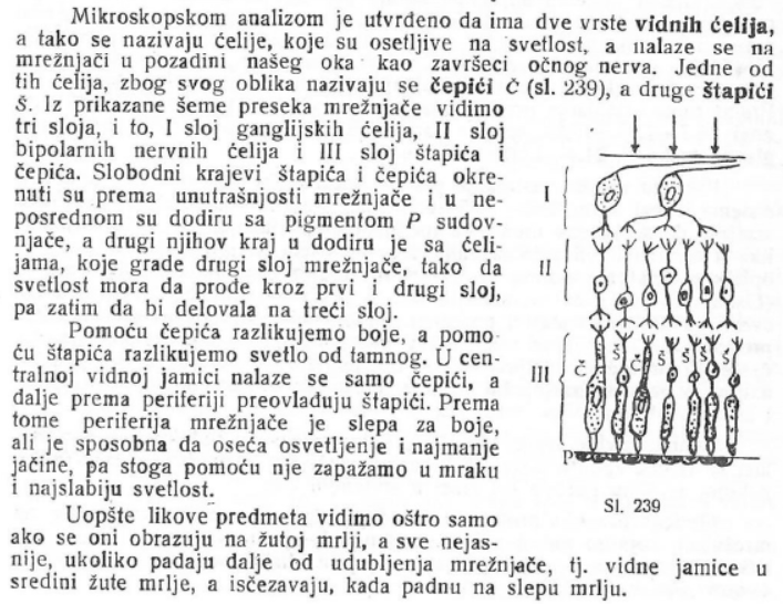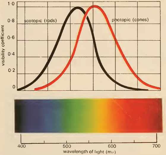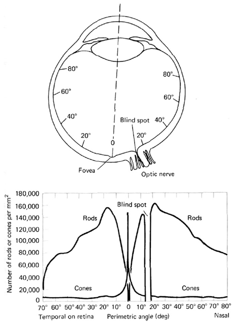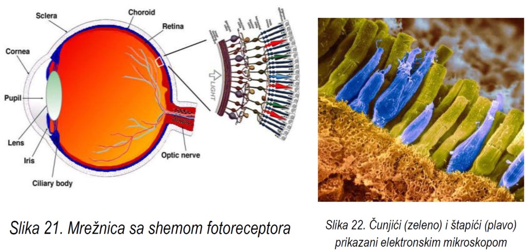 Naše oči sadrže dvije vrste fotoreceptora za vid – štapiće, koji nam pomažu da vidimo kod slabe svjetlosti, ali ne daju boju, i čunjići, koji rade kada je svjetlo jako i dijele svijet na tri boje: plava, zelena i crvena. Postoji samo jedna vrsta štapića (zato ne učestvuju u stvaranju boje) i oni su najosjetljiviji pri talasnoj dužini svjetlosti od oko 500 nm. Svjetlost privremeno izbjeljuje štapiće (iz purpurne boje do transparentnog (providnog) stanja) koji imaju relativno dugo vrijeme oporavka, 25 min – tj. kada se nadraže i prenesu nervni impuls treba im oko 25 min da se vrate ponovo u receptivno stanje. Ima ih oko 120 miliona u perifernom dijelu izvan fovee koja ima prečnik oko 1 mm. Odgovorni su za noćnu viziju (skotopična vizija). Čunjića ima 3 tipa, plavi, zeleni i crveni (zato učestvuju u stvaranju boje), sa maksimumom osjetljivosti pri talasnim dužinama 440 nm (plava), 520 nm (zelena) i 570 nm (narandžasta). Ima ih oko 6 miliona, uglavnom koncentrisanih u regionu fovee, pri čemu je 64% crvenih, 32% zelenih i 2% plavih. Čunjići su odgovorni za dnevnu viziju (fotopična vizija). Vrijeme oporavka im je kratko. Ljudi koji su “slijepi za boje” obično nemaju jednu od tri vrste čunjića, tako da ne vide sve boje, samo neke od njih. Ljudi koji uopće nemaju čunjeve, i istinski su slijepi za boje, nazivaju se ahromatopi. Njihov glavni problem nije u tome što je njihov svijet blijed, nego u tome što se oni teško nose s jakim svjetlom i mogu biti doslovno zaslijepljeni dnevnim svjetlom.