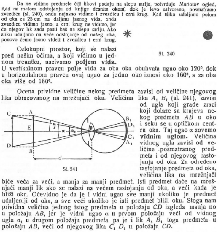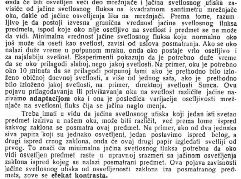 Brzina prijema opažanja ili percepcije svjetlosnih draži kreće se od 1/100 do 3/10 sekunde. Pri gledanju u vertikalnom smjeru vrijeme percepcije duže je nego u slučaju pomjeranja pogleda u horizontalnom pravcu. Posebno je značajno da interval između dva nadražaja, ako želimo da oba budu registrirana, traje najmanje 0,2 sekunde. Dužina opuštanja akomodacije oka pri radu na blizinu veća je nego kod akomodacije na daljinu. Prosječna akomodacija traje 0,4 do 0,5 sekundi, zamor je produžuje, ali ne utiče na njeno opuštanje.