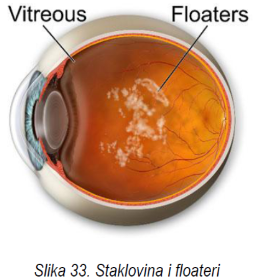Staklasto tijelo (lat. corpus vitreum) ili staklovina prozirna je želatinozna materija koja ispunjava unutrašnjost oka. Po sastavu je slična rožnici, ali za razliku od nje sadrži jako malo stanica tako da se čak do 99 % volumena staklastog tijela sastoji od vode. Ostatak čine so, glukoza, proteini te kolagenska vlakna koja mu daju želatinoznu strukturu (slika 33). Za razliku od očne vodice koja se stalno proizvodi i oplahuje prednje očne strukture, želatinozno staklasto tijelo je stagnirajuće, tj. postoji od rođenja i ne mijenja se značajno prilikom starenja. Staklovina vrši konstantan pritisak na mrežnicu fiksirajući je na žilnicu i održavajući je stabilnom. Kolagenska vlakna staklovine mogu se starenjem taložiti ili raspasti te tako razvodniti želatinoznu strukturu vitreusa. Na taj način nastaju plutajući opaciteti u staklovini koje nazivamo leteće mutnine ili floateri (slika 33). Oni izazivaju subjektivne smetnje, ali su obično bezazleni, iako ponekad mogu ukazivati na određene bolesti oka. Indeks refrakcije u staklovini je oko 1.3, za razliku od indeksa loma leće od 1.4.