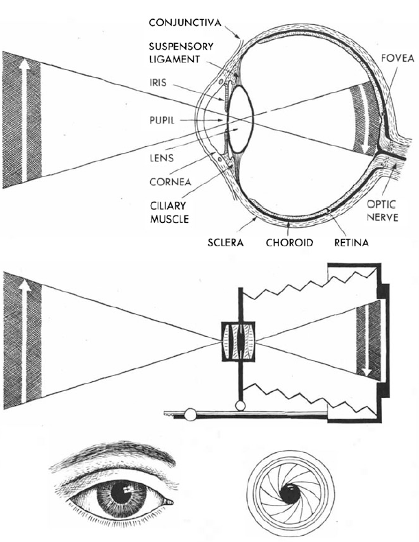 Uloga oka je analogna fotoaparatu ili kameri (slika 4). Prednji dio jabučice (rožnica i leća), slično leći kamere, služi za primanje i fokusiranje svjetla, a stražnji dio (mrežnica) odgovara fotografskom filmu na kojem se formira upadna slika. Slika je na mrežnici obrnuta i umanjena.