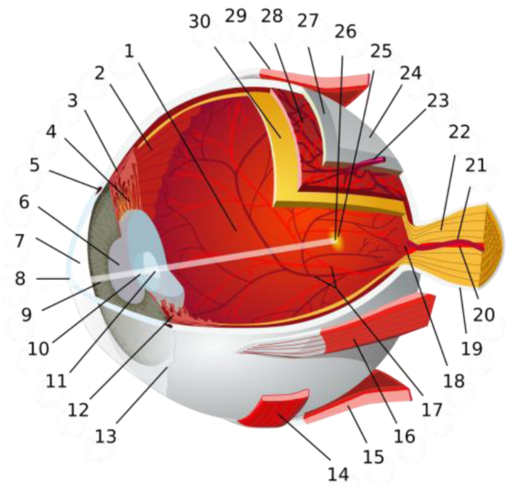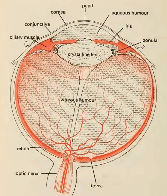 Kao što biste očekivali od ovako složenog instrumenta, oko ima mnogo dijelova od kojih su nam neki poznati po imenu (šarenica, rožnica, mrežnica), a drugi manje poznati (fovea, žilnica, bjeloočnica). U osnovi oko je kamera. Prednji dio, leća i rožnica, hvataju slike u prolazu i projiciraju ih na stražnju stranu zida oka – mrežnicu, gdje ih fotoreceptori pretvaraju u električne signale koji se prenose u mozak preko vidnog živca.