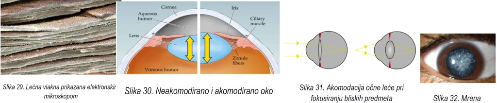 Lećna vlakna čine najveći dio njezine strukture (slika 29). Sastoje se od prozirnih i elastičnih vlakana savijenih u koncentrične slojeve poput glavice luka. Lećna vlakna ispunjena su bjelančevinom iz skupine kristalina i zato se očna leća ponekad naziva i kristalinska leća. Leća je na ekvatoru suspenzornim ligamentima povezana s cilijarnim mišićem, čijom kontrakcijom mijenja svoj oblik odnosno zakrivljenost, što omogućava promjenu njene fokusne dužine i fokusiranje slike na raznim udaljenostima. Promjena oblika leće prilikom fokusiranja slike naziva se akomodacija (slike 30 i 31). U prosjeku leća ima jačinu od oko 20 dioptrija, što je otprilike 1/3 ukupne dioptrijske jakosti oka. Leća može akomodirati po nekoliko dioptrija, što ovisi o starosti oka. Kada leća izgubi svojstvo akomodacije, nastupa staračka dalekovidnost odnosno prezbiopija (lat. presbyopia), tj. nemogućnost fokusiranja slike za bliske predmete (npr. prilikom čitanja). Uz prezbiopiju, najčešći je poremećaj očne leće njeno zamućenje koje se naziva katarakta ili mrena (lat. cataracta) (slika 32). Zamućenja leće nastaju uglavnom prirodnim starenjem (senilna katarakta), ali mogu biti i urođena (kongenitalna) ili uzrokovana lijekovima, zračenjem itd. Katarakte se liječe operativnim putem, što je danas najčešća operacija na svijetu.