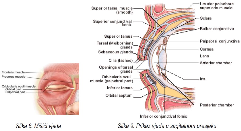 Vjeđe ili kapci (lat. palpebrae) su pokretna tkiva koja prekrivaju i štite oko. One pravilno i kontinuirano razmazuju suzni film preko rožnice kako bi ostala stalno vlažna. To je važno jer stanice rožnice, zbog potrebe za prozirnošću prednjeg dijela oka, ne mogu biti opskrbljivane krvnim žilicama već se hrane preko suznog filma koji sadrži nutrijente. Osim što služe razmazivanju suznog filma, vjeđe ujedno štite i čiste površinu rožnice ravnomjernim treptanjem (prosječno svake četiri sekunde). Gornja i donja vjeđa međusobno su spojene na dva mjesta s obje strane, čineći vjeđni rasporak. Vjeđe obično sežu sve do rubova rožnice, a često je i malo pokrivaju. Sastavljene su od vrlo tankog sloja kože s vanjske strane, a s unutarnje od sluznice i mišića koji ih ritmično zatvaraju i otvaraju. Vjeđe sadrže i čvrsti vezivni dio – tarzus – koji im osigurava polukružni oblik. Na prednjoj strani se nalaze trepavice (lat. ciliae), dlačice koje su osjetljive na dodir i izazivaju refleksno zatvaranje vjeđa pri dodiru sa stranim tijelima iz okoline. Vjeđe zatvara kružni mišić (lat. m. orbicularis oculi) (slika 8), a otvara poprečnoprugasti podizač prednje vjeđe (lat. m. levator palpabrae superior). Rubove vjeđa podmazuju Meibomove tarzalne žlijezde lojnice (oko 60-70 u obje vjeđe) (slika 9).