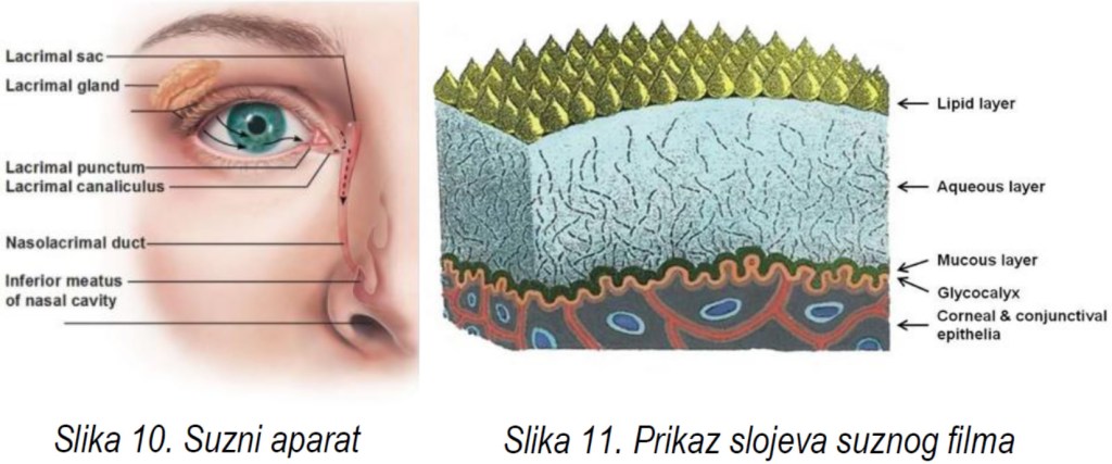 Suzni aparat sudjeluje u stvaranju, zaštiti i odvođenju suza. Sastoji se od glavne i pomoćnih suznih žlijezda i sistema odvodnih kanala (slika 10). Dio suznog aparata zadužen za stvaranje suza (tzv. sekretorni) čini suzna žlijezda (lat. glandula lacrimalis). Ona je smještena u vlastitom udubljenju u gornjem lateralnom dijelu orbite. Proizvodi vodeni sloj suznog filma i prazni se preko desetak odvodnih kanalića. Pomoćne žlijezde nalaze se u spojnici i osiguravaju bazalnu sekreciju suza. Osim njih, neke stanice spojnice, kao i žlijezde rubova vjeđa, takođe spadaju u sekretorni dio suznog aparata. Suzni film sastoji se od triju slojeva: lipidni (vanjski), vodeni (srednji) i mukozni (unutrašnji) (slika 11). Lipidni sloj izluđuju Meibomove i ostale vjeđne žlijezde, a služi smanjenju gubitka suza isparavanjem, u čemu ih sprečava gornji sloj izlučenih lipida. Najveći je dio suznog filma vodeni sloj koji, između ostalog, sadrži elektrolite, enzime i metabolite. Mukozni sloj bitan je za podmazivanje i zaštitu rožnice. Glavni je dio odvodnog (ekskretornog) sistema oko 10 mm velika suzna vrećica (lat. lacrimal sac). Do nje suze dolaze kroz dvije suzne tačke (lat. puncta lacrimalia), smještene oko 6 mm od medijalnog očnog kuta, koje su preko dva suzna kanalića (lat. lacrimal canaliculus) povezane sa suznom vrećicom. Suze iz vrećice otječu u suzonosni kanal (lat. ductus nasolacrimalis) i dalje u donji nosni hodnik. Oko četvrtine suza isparava na površini oka, dok se ostatak izlučuje iz oka prilikom kontrakcije mišića tijekom treptanja. Pri tome dolazi do potiskivanja suza na suzne tačke uz istovremeno širenje suzne vrećice koja ih usisava. Nakon toga, kontrakcijom mišića suzne vrećice suze se dalje odvode kroz suzonosni kanal.