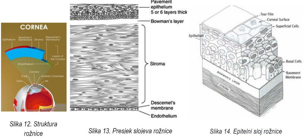 Tanki prednji epitelni sloj (slika 14) u doticaju je sa suznim filmom i sastoji od brzo sazrijevajućih i lako regenerativnih stanica. Primarno služi kao barijera infekcijama i vanjskim utjecajima. Ispod njega se proteže tanka, ali elastična, Bowmanova membrana koja štiti rožničnu stromu. Ona nema sposobnost regeneracije. Stroma je debeli, transparentni srednji sloj sastavljen od pravilno poredanih kolagenih vlakana i rijetkih keratocita. Rožnična stroma čini 90 % debljine rožnice i sastoji od približno 200 slojeva ukupne debljine oko 0,4 – 0,5 mm.