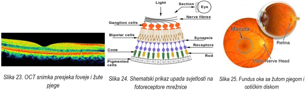 Žuta pjega ili makula (lat. macula lutea) ograničeno je područje najjasnijeg centralnog vida širine oko 5,5 mm, u čijem je centru depresija koje se zove foveja (cca 0,4 – 0,5 mm), a sadrži centralni udubljeni dio ili foveolu (promjera cca 0,35 mm) sastavljenu samo od čunjića, bez ganglijskih stanica (slika 23). Postoje tri vrste čunjića, ovisno o vrstama pigmenata, osjetljivih na plavo, zeleno i crveno svjetlo (u rasponu talasnih dužina od 380 do 760 nm). Crvenih čunjića ima duplo više od zelenih, a čak 32 puta više od plavih (kojih uopće nema u centru makule). Žuta boja makule dolazi od luteina u čunjićima. Za reakciju u fotoreceptorima mrežnice zaslužni su pigmenti rodopsin i jodopsin. Čunjići i štapići u kontaktu su s pigmentnim slojem epitelnih stanica, okrenuti od smjera dolaska svjetlosti, tako da na njih svjetlost dolazi tek nakon što prođe gornje slojeve mrežnice (ganglijske stanice i živčana vlakna) i reflektira se od pigmentiranog epitela. Tako se olakšava razmjena hranjivih tvari između epitela i fotoreceptora (slika 24). Anteriorno fotoreceptorima nalaze se živčana vlakana i ganglijske stanice čiji se aksoni protežu prema papili očnog živca koju nazivamo optičkim diskom ili slijepom pjegom (lat. papilla nervi optici) jer ne sadrži fotoreceptore (slika 25). Fotoreceptori čine prvi od tri neurona vidnog puta, dok treći čine ganglijske stanice. Kompleksne slike preko vidnog puta dolaze do vizualnog korteksa u mozgu gdje se stvara fenomen vida.